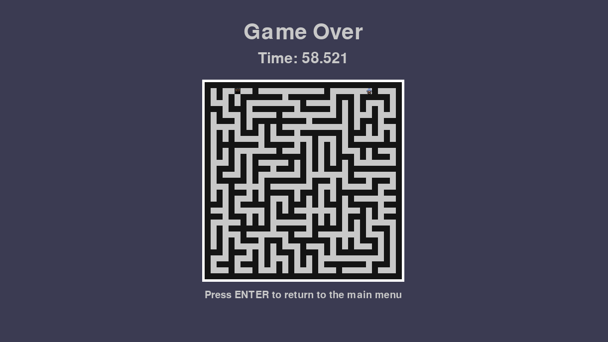 A simple maze game where the player has to navigate through a maze to reach the end. The maze is generated using Wilsons generation algorithm which generates a non-biased maze.